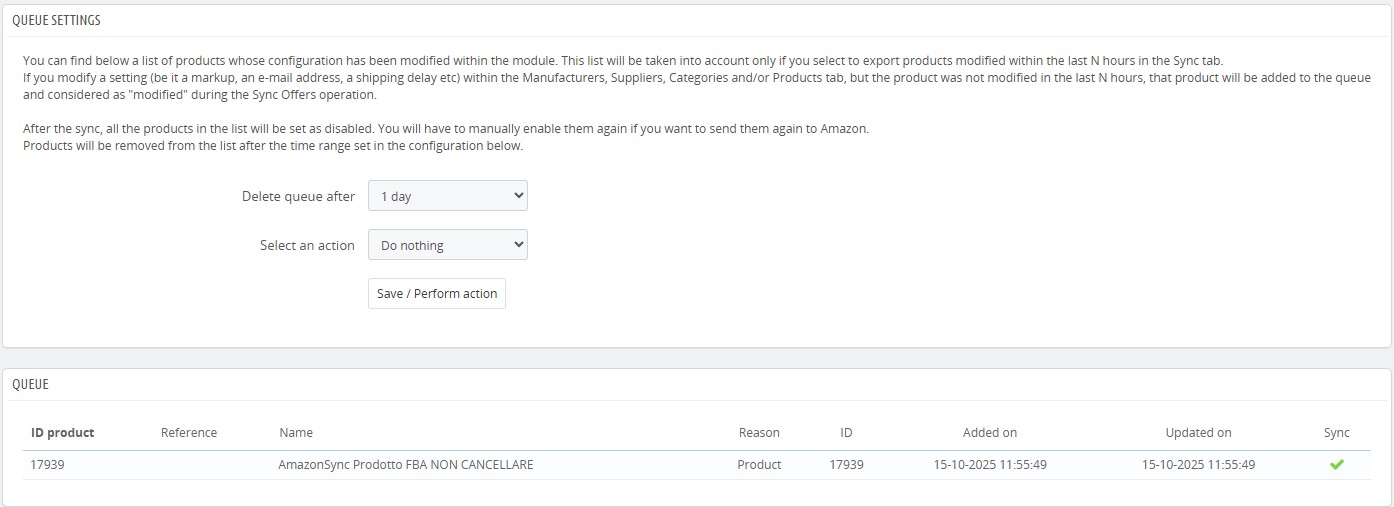 - Delete queue after: 1, 7, 15 days. Depending on the value selected, the list of modified products will remain visibile for the amount of days you chose. After that limit is reached, products will be removed from the list after the first Sync Offers.